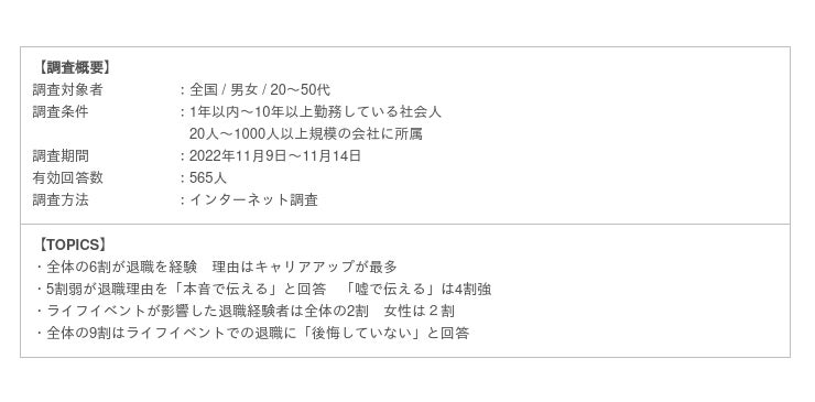 キャリアや就職・転職全般に関する研究や各種調査を行う機関『Job総研(※1)』を運営する株式会社ライボ(本社:東京都渋谷区 代表取締役:小谷匠 以下「ライボ」)は、565人の社会人男女を対象に「2022年 退職に関する実態調査」を実施しました。同調査は退職経験の有無やその理由、退職理由の本音と嘘の内容や、男女別のライフイベントと退職の関連性などについて調査しました。