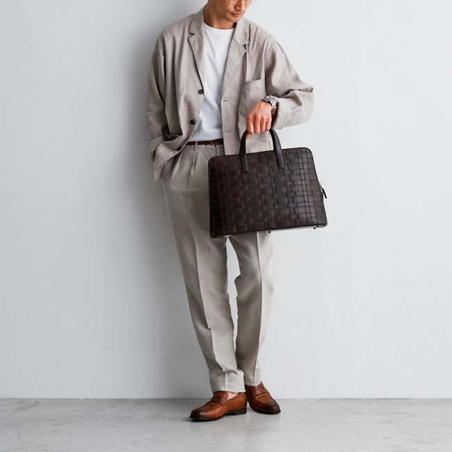 底辺からバッグ上部にかけてマチがスリムに設計されたビジネスバッグですが、A4サイズの書類や13インチまでのPCが収納可能です。レザーのペンホルダーやファスナー付きポケットに加え、底鋲でしっかり自立する機能性を備え、ミニマルなデザインながら、ビジネスシーンをスマートに演出します。