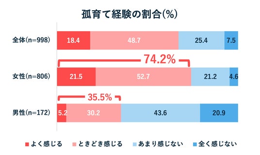 子育て中または子育て経験のある「ピアッザ」ユーザー998名に、子育て中に孤立や孤独を感じたことがあるかを尋ねました。その結果、女性の74.2%が孤独を感じたことがあると回答(よく感じる:21.5%、ときどき感じる:52.7%の合計)し、孤独を感じたことがある男性(よく感じる:5.2%、ときどき感じる:30.2%、合計35.5%)と比べて、2.1倍も孤独を感じていることがわかりました。