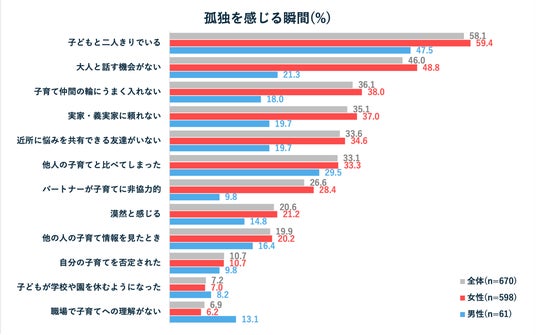 孤独を感じる瞬間は「子どもと二人きりでいる」ときが最多、 男女差が特に大きいのは「大人と話す機会がない」で女性は男性の2.3倍。
