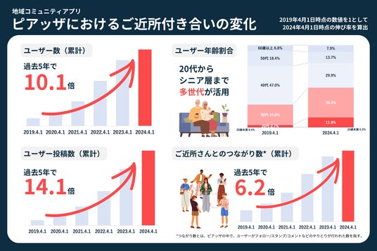 「ピアッザ」は、全国70自治体と連携し、東京・神奈川・愛知・大阪の都市部を中心に90以上の地域(エリア)で展開※する地域密着型のソーシャルメディアプラットフォーム。ユーザー数は15万人を超え、東京都中央区では30~40代の子育て世代の約4割が利用しています。困った時に街の人に質問ができる「おしえて」機能や不要品をリユースできる「お譲り」機能など、ご近所さん同士による”気軽な助け合い”が実現できます。