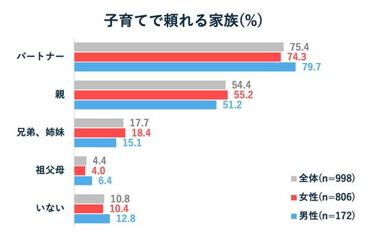 最後に、子育てに関して頼れる存在について尋ねました。子育てで頼れる家族は「パートナー」が最多で、女性は74.3%、男性は79.7%と特に高いことがわかりました。また、男女共に半数以上(女性:55.2%、男性:51.2%)の人が子育て中に親を頼るという一方で、10人に1人は頼れる家族がいないことが明らかになりました。