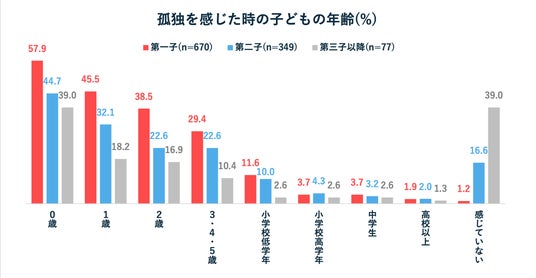 孤独を感じたことがある人に、子どもの年齢がいくつの頃に孤独を感じたのかを聞きました。孤独を感じている割合が高いのは新生児~未就学児の頃で、特に第一子が0歳の時は57.9%の人が孤独を感じていました。子どもが大きくなるにつれて孤独を感じる機会は減少しますが、子どもの人数に関わらず、子どもが0歳の頃は孤独を感じやすい傾向があります。