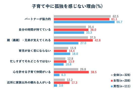 - 孤独を感じない理由:男女共に「パートナーが協力的」が6割以上で多数を占める。女性の「心を許せる子育て仲間がいる」割合は男性の6.1倍(女性:38.5%、男性:6.3%)。
