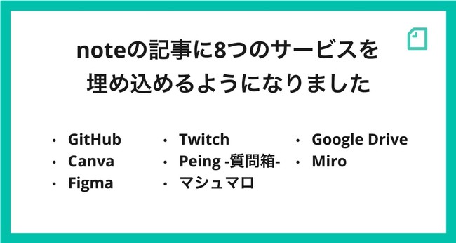 noteでは、新たに8つの外部サービスを記事内に埋め込み表示できるようになりました。