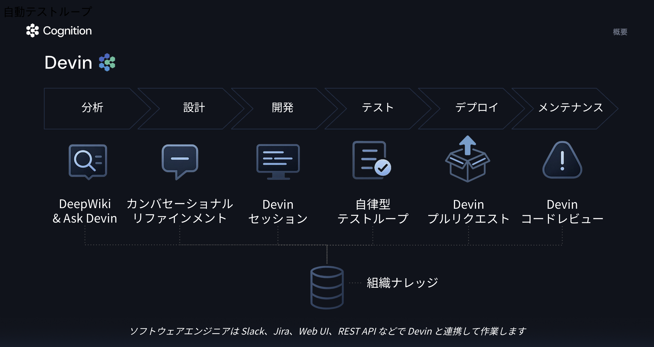 Devinは、幅広いソフトウェア開発業務を自律的に実行し、エンジニアリングチームと円滑に協働できる自律型AIソフトウェアエンジニアです。ジュニアエンジニア相当の役割を担うことができ、SlackやTeamsといったコミュニケーションツール、Jiraなどのプロジェクト管理ツール、API(アプリケーション間連携)、または専用のDevinインターフェースを通じて管理・操作することが可能です。