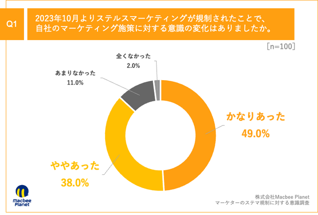 「Q1.2023年10月よりステルスマーケティングが規制されたことで、自社のマーケティング施策に対する意識の変化はありましたか。」(n=100)と質問したところ、「かなりあった」が49.0%、「ややあった」が38.0%という回答となりました。