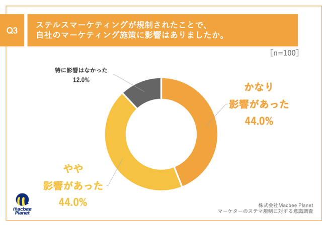 「Q3.ステルスマーケティングが規制されたことで、自社のマーケティング施策に影響はありましたか。 」(n=100)と質問したところ、「かなり影響があった」が44.0%、「やや影響があった」が44.0%という回答となりました。