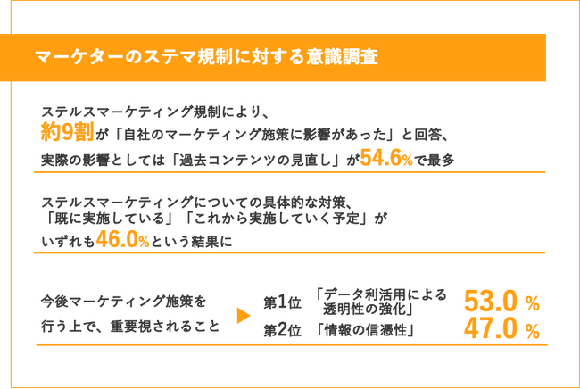 まず、2023年10月からステルスマーケティングの規制が施行されたことに対し、約9割が自社のマーケティング施策に対して「意識の変化があった」と回答しました。また、ステルスマーケティング規制により「自社のマーケティング施策に影響があった」という企業は約9割にのぼり、実際の影響としては「過去コンテンツの見直し」(54.6%)、「インフルエンサーの選定基準の見直し」(50.0%)が上位になっています。さらに、ステルスマーケティングについての具体的な対策については、「既に実施している」「これから実施していく予定」がいずれも46.0%という結果になり、その対策方法としては、57.6%が「自社だけでなく外部のパートナーや専門家に相談する」、42.4%が「自社のみで対応」と回答しました。最後に、今後マーケティング施策を行う上で重要視されるポイントを聞いたところ、「データ利活用による透明性の強化」が53.0%、「情報の信憑性」が47.0%という結果が出ています。