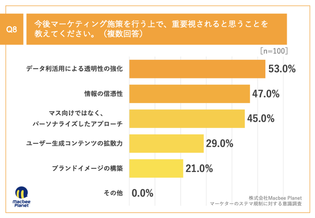 「Q8.今後マーケティング施策を行う上で、重要視されると思うことを教えてください。(複数回答)」(n=100)と質問したところ、「データ利活用による透明性の強化」が53.0%、「情報の信憑性」が47.0%、「マス向けではなく、パーソナライズしたアプローチ」が45.0%という回答となりました。