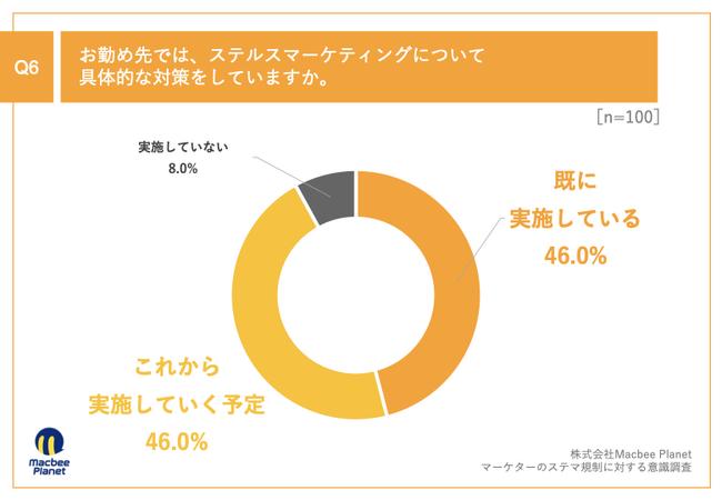 「Q6.お勤め先では、ステルスマーケティングについて具体的な対策をしていますか。」(n=100)と質問したところ、「既に実施している」が46.0%、「これから実施していく予定」が46.0%という回答となりました。
