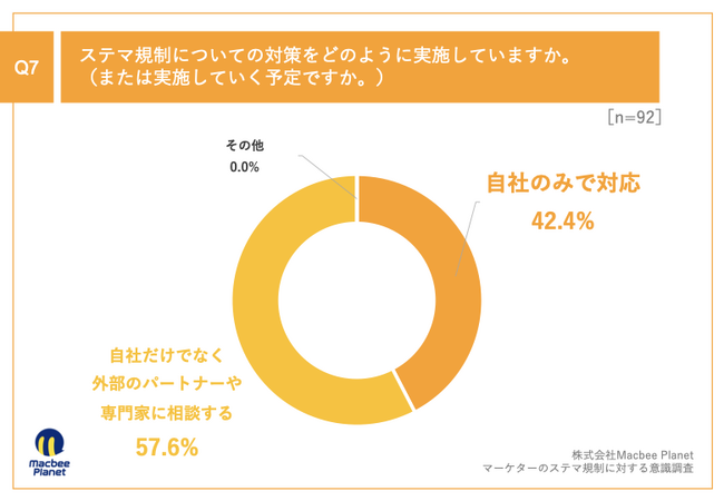 Q6で「既に実施している」「これから実施していく予定」と回答した方に、「Q7.ステマ規制についての対策をどのように実施していますか。(または実施していく予定ですか。) 」(n=92)と質問したところ、「自社だけでなく外部のパートナーや専門家に相談する」が57.6%、「自社のみで対応」が42.4%という回答となりました。