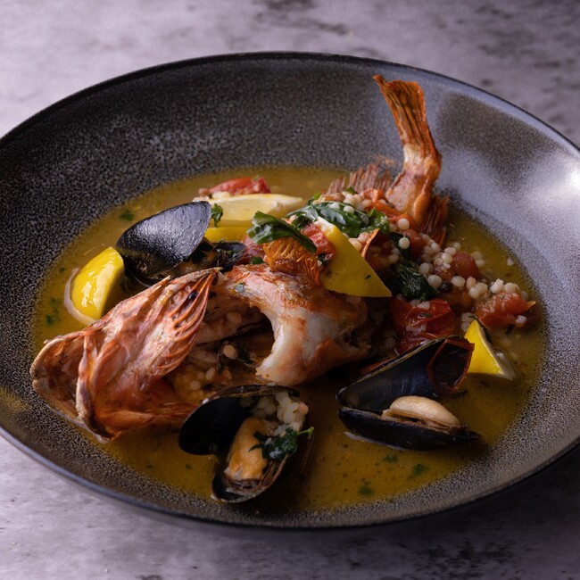 ・柑橘香るアクアパッツァ、フレーゴラパスタとボッタルガ 、その日の旬の魚をシェフスタイルで