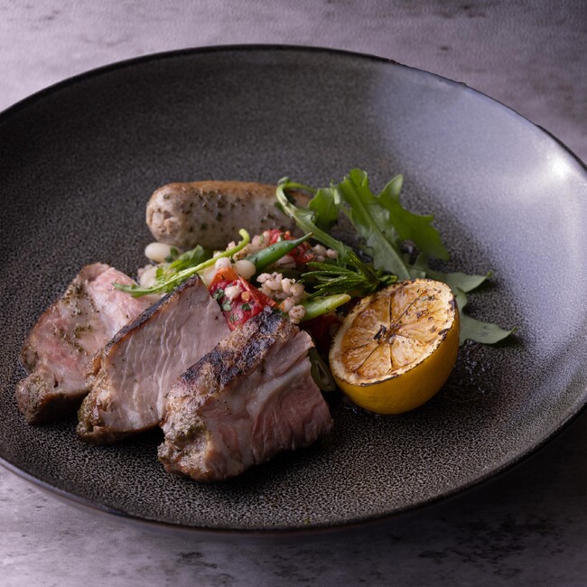 ・フィレンツェ風神戸ポークのグリルとサルシッチャ 、いろいろな豆と国産もち麦、ドライトマトとローズマリー