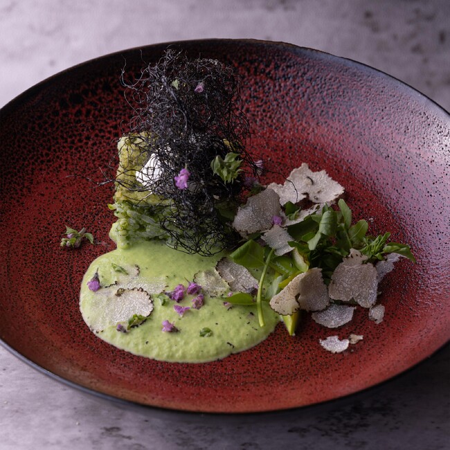 ・海藻と大葉の焼きリゾット、グリーンアスパラガス 、神戸弓削牧場フレッシュチーズとサマートリュフ