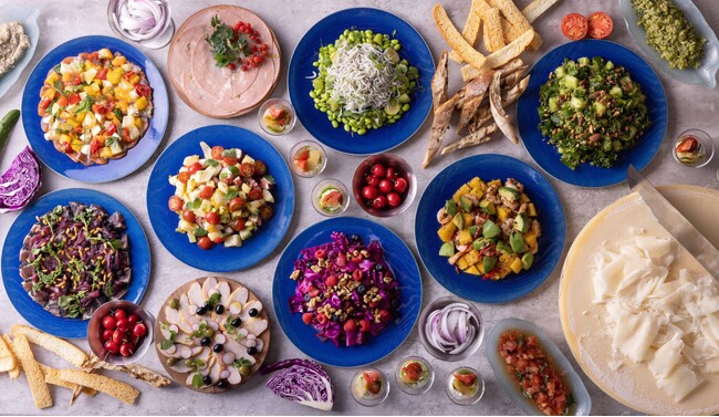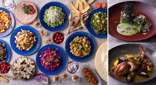 また、夏の食材をふんだんに使用した季節の前菜が鮮やかに並ぶビュッフェコーナーでは、サマーフルーツや、健康や環境にやさしい食生活として世界でも注目が高まりつつあるプラントベース(植物性由来の原料の食材)を使用したカラフルで爽やかなメニューが揃います。柑橘系フルーツをソース替わりに、セミドライトマトと合わせたオレガノ風味の「サーモンカルパッチョ」や、グリーン野菜をミントピューレやメロンと和え、アーモンドの食感をアクセントにした「グリーンキヌアサラダ」、蛸とセロリ、マンゴー、チェリートマトをスモークの香りで纏わせた「蛸のスモーク風味」、グリルしたピーチを自家製豆乳フレッシュチーズでバジルトマトサラダに仕立てた「グリルドピーチ」など、イタリア料理とも相性の良い夏の食材を使用した前菜をお召し上がりいただけます。