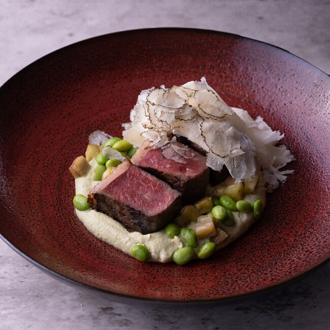 ・国産牛のグリル150gとパルミジャーノ、水茄子、枝豆のマッシュ、サマートリュフ (追加料金+3000円)