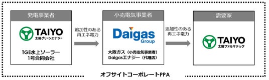 新設した水上太陽光発電所では、同じく太陽ホールディングスの子会社である太陽ファルマテック株式会社(本社:大阪府高槻市、代表取締役社長:佐藤 英志)向けのオフサイトコーポレートPPA(※2)を大阪ガス株式会社(以下「大阪ガス」)及び大阪ガスの子会社であるDaigasエナジー株式会社を通じ締結することで、4月1日よりグループ間で初となるオフサイトコーポレートPPAモデルを活用した追加性(※3)のある再エネ電力の供給が可能になり、年間CO2削減効果は約1,300tCO2を見込んでおります。