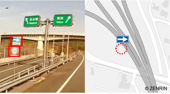 ▲高速道路の規制標識を画像認識(左)し、地図上該当箇所(右)と比較し差分を検出