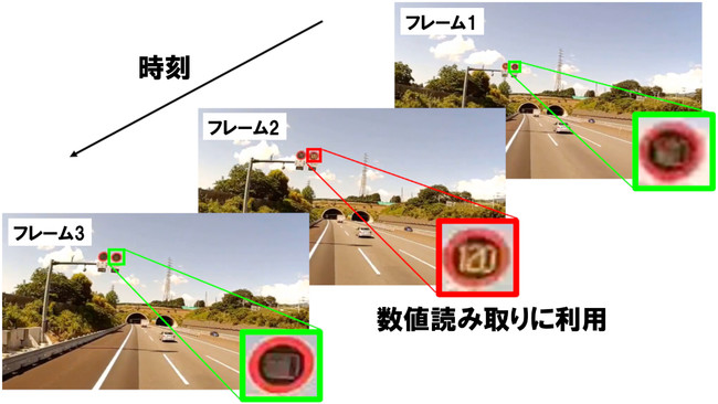▲LED式の速度制限標識の数値は映像に映らない瞬間があるが、適切な瞬間を選ぶことで読み取りが可能。