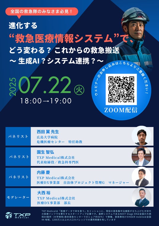 医療DX領域を担うTXP Medical株式会社(本社:東京都千代田区、代表取締役:園生智弘)は、2025年7月22日(火)18:00より、全国の救急隊・消防・自治体・医療機関向けにWebinar「進化する“救急医療情報システム”で、どう変わる?これからの救急搬送 ~ 生成AI?システム連携?~」を開催いたします。