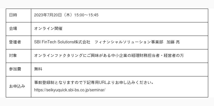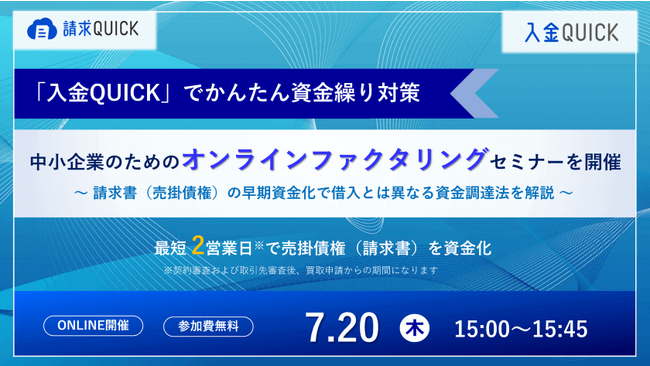 総合フィンテックソリューション企業であるSBI FinTech Solutions株式会社の子会社で、バックオフィス支援サービスを提供するSBIビジネス・ソリューションズ株式会社(本社:東京都港区、代表取締役社長:夏川 雅貴、以下「当社」)は、経理DXを加速するクラウド型請求書管理システム「請求QUICK」のオンラインファクタリングサービス「入金QUICK」で実現する「中小企業のためのかんたん資金繰り改善セミナー」を7月20日(木)15時より開催しますので、お知らせいたします。