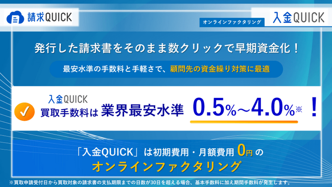 「入金QUICK」は、中小企業の突発的な資金ニーズにスピーディーに対応可能なオンラインファクタリングサービスです。「請求QUICK」で発行した請求書をそのまま数クリックで資金化でき、基本手数料は買取対象とする請求書金額の0.5%~4.0%*1と業界最安水準かつ初期費用や月額固定費用のないシンプルな料金体系で、請求書買取申請から最短2営業日*2でお振込みが可能です。「入金QUICK」は、中小企業の皆さまが抱える資金繰りに関する課題を「早さ・安さ・手軽さ」すべての点において解消し、事業の成長をご支援いたします。