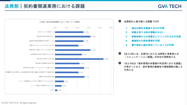 ・法務部門が抱える課題の1位は「過去案件の調査」、非法務部門が抱える課題の1位は「回答までの時間」。
