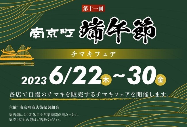 一般財団法人神戸観光局(所在地:神戸市中央区・以下「神戸観光局」)は、2023年6月22日(木) ~30日(金)の9日間、神戸南京町にて「第11回南京町端午節 チマキフェア」を開催することをお知らせいたします。