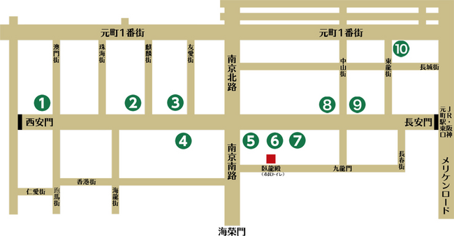 ※JR・阪神元町駅から南へ徒歩約5分、阪急神戸三宮駅から南西へ徒歩約10分、市営地下鉄海岸線旧居留地・大丸