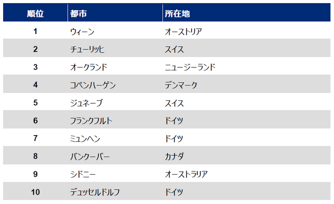 世界生活環境調査・世界で最も環境に優しい都市ランキングの詳細( https://www.mercer.com/ja-jp/insights/total-rewards/talent-mobility-insights/quality-of-living-city-ranking/ )も併せてご覧ください。