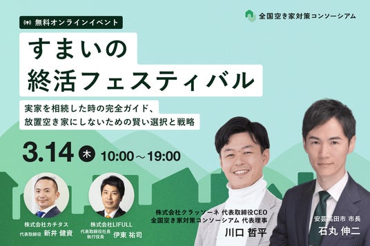 解体工事のDXプラットフォームを手掛ける株式会社クラッソーネ(愛知県名古屋市, 代表取締役 川口哲平)は、代表理事を務める「全国空き家対策コンソーシアム(愛知県名古屋市, 代表理事 株式会社クラッソーネ)」主催のオンラインイベント「すまいの終活フェスティバル」を3月14日(木)に開催します。家じまいや空き家の整理に悩みを持つ方々に向けて、様々なご意見番をお招きして、空き家問題の解決策について一緒に考えるオンラインイベントです。