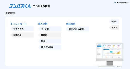成果を出すためのブランド戦略からサイト構築、SEO、集客支援までワンストップで手掛けるデジタルマーケティング カンパニー、株式会社ニュートラルワークス(神奈川県茅ヶ崎市、代表取締役:三木五月/以下、ニュートラルワークス)が、Webサイトの状況を分かりやすく可視化させる、マーケティングルーツ「コンパスくん」を提供開始いたします。