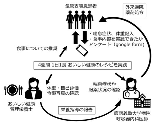 本研究の参加者は、慶應義塾大学病院で喘息を治療中の方を対象とし、最初の4週間においしい健康アプリが提案する管理栄養士監修メニューを召し上がっていただき、次の4週間に自己管理期間として任意でおいしい健康アプリを用いた食事管理を行います。その後、喘息症状、体重、体組成、呼吸機能などの臨床データ、血清中の脂質や便中の腸内細菌叢などの分析データを組み合わせ、食事介入が喘息に与える影響とその機序を多角的に解析いたします。