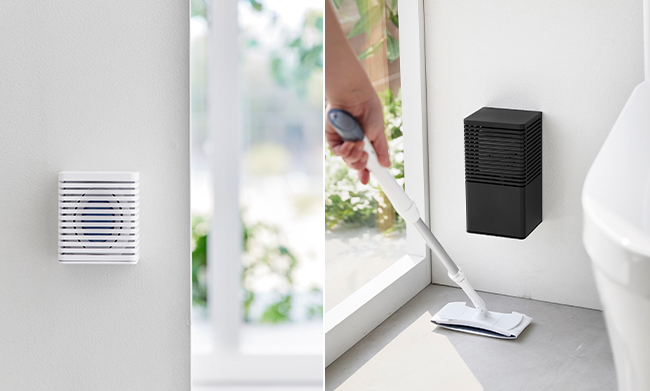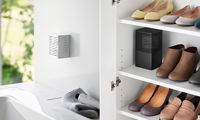 置き場所に困る消臭剤や防カビ剤をマグネットで玄関扉や浴室壁面に浮かせて収納。