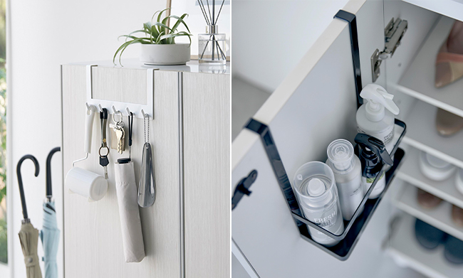 下駄箱扉の両面を使用できる引っ掛けフック&ツールホルダー。