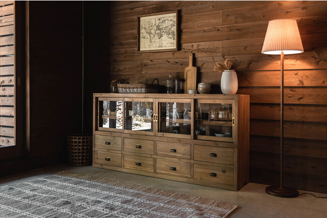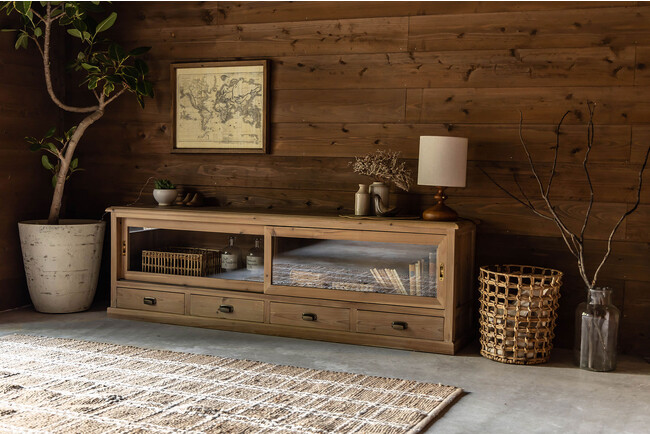 古材の趣ある風合いを存分に楽しめるリビングボード。ガラス引き戸と引出し付きで、ホコリから守って収納できます。天面はTVを置いてテレビボードとして、またはお気に入りを飾るディスプレイスペースとして使うのも◎。ライフスタイルに合わせて多様な使い方ができます。