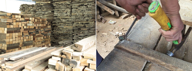 クラッシュでは、主に古民家を解体した際に出てくる梁や柱、建具などを古材として使用しています。こうして出てきた古材は釘や汚れを落とし、乾燥や製材などの工程を経て初めて家具として使える材料となります。そのため、釘穴の跡や経年変化した木の色など、新材とは異なる古材にしか出せない表情や雰囲気を持っています。そういった古材の特性を私たちは「個性」と考えて、もの作りに活かしています。