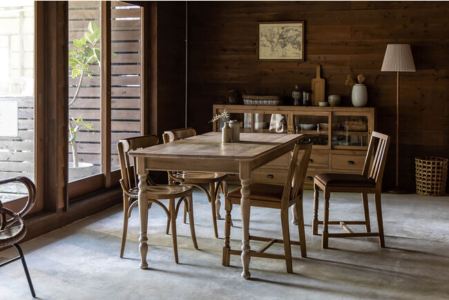 クラシカルなろくろ脚のデザインが特徴のダイニングテーブル。古材の優しい風合いと曲線が織りなす柔らかな雰囲気が、懐かしくも温かみのある空間を演出してくれます。