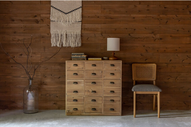 薬棚をモチーフにしたキャビネット。引出しは全部で12杯あり(上2段:6杯、下4段:6杯)、整理整頓に役立ちます。天面はディスプレイスペースとして照明やお気に入りの物を飾るなど、自分らしい空間づくりを楽しめます。
