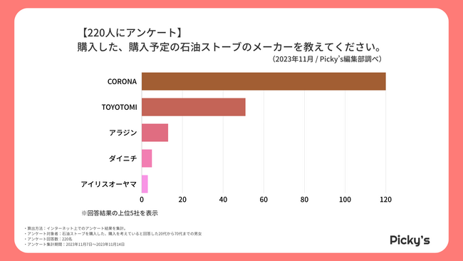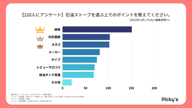 「Picky’s」は、インターネットショッピングにおいて、購入前に試せない・選ぶべきものがわからないという課題の解決を目標に、あらゆる商品のおすすめランキングや検証レビューを紹介するサイトです。このたびPicky’s(https://rentry.jp/note/)では、冬物関連に先駆けて、石油ストーブについてインターネット上でアンケート調査を行いましたので発表いたします。