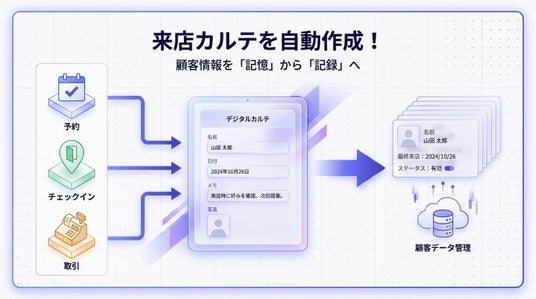 本機能は、来店時の予約・チェックイン・取引(会計)をトリガーとして 顧客カルテを自動作成 し、施術内容・接客メモ・写真などを一元管理できる機能です。美容サロン・整体院・小売・飲食店など、来店型ビジネスにおける顧客情報の属人化・紙カルテの煩雑さ を解消し、スタッフ全員が過去の対応履歴を共有できる環境を実現します。