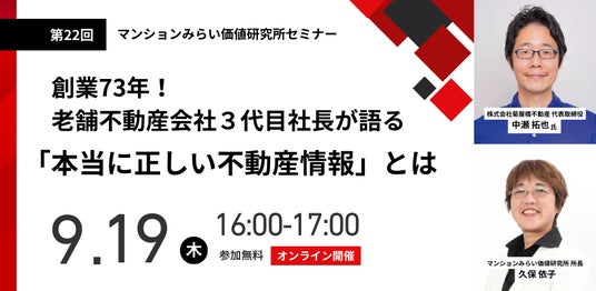 大和ハウスグループの大和ライフネクスト株式会社(本社:東京都港区、代表取締役社長:竹林 桂太朗) の分譲マンション総合研究所「マンションみらい価値研究所」は、マンションのみらいを考える無料WEBセミナー『創業73年!老舗不動産会社3代目社長が語る本当に正しい不動産情報とは』を、2024年9月19日(木)に、当社の情報発信プラットフォーム「赤坂プラスタ」よりライブ配信いたします。