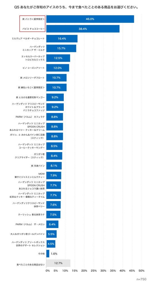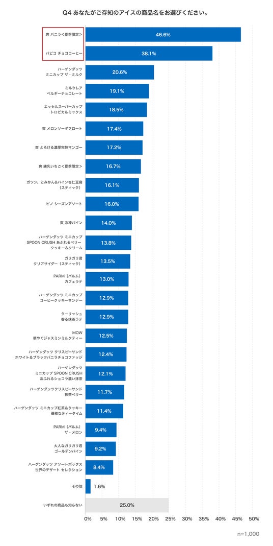 認知しているアイスの商品名を聞いたところ、認知率が最も高いのは「爽 バニラ<夏季限定>」(46.6%)で、「パピコ チョココーヒー」(38.1%)が続き、3番目に高い「ハーゲンダッツ ミニカップ ザ・ミルク」(20.6%)との差は17.5ポイントと大きく引き離しています。