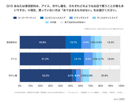 清涼飲料水、アイス、冷やし麺を、それぞれどのようなお店で買うことが最も多いかを聞いたところ、最頻購入チャネルは、3カテゴリーともに「スーパーマーケット」がほぼ5割で圧倒的に高い結果でした。清涼飲料水とアイスでは、「コンビニエンスストア」が1割台、「ドラッグストア」が1割弱で続きました。冷やし麺のみ、0.3ポイントの僅差ながら、「スーパーマーケット」に続いて「ドラッグストア」(4.4%)が「コンビニエンスストア」(4.1%)を上回っています。