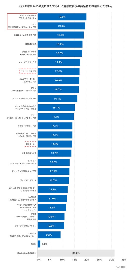 この夏に飲んでみたい清涼飲料水の商品名を聞いたところ、飲用意向率が最も高いのは「サントリー C.C.レモン マスカットスカッシュ」(19.8%)で、「アサヒ 三ツ矢特濃グレープスカッシュ PET」(19.3%)が続く結果でした。