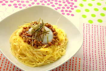 ゆでたスパゲッティに、たまご醤油たれ、ピザ用チーズ、温泉卵、白ごま、切のりをのせるだけ。納豆は添付のたれにミツカン「味ぽん(R)」を入れて混ぜると、まろやかながらさっぱりとした味わいです。