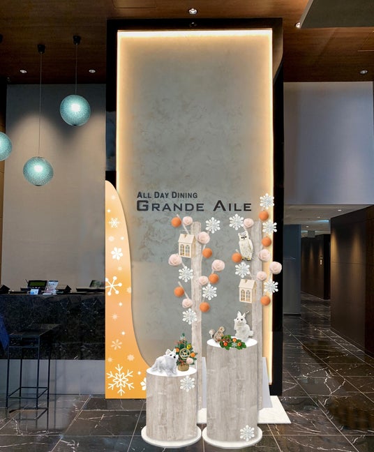 「冬の贈り物」フェア限定でスパークリングワイン「ボッテガ・ロゼ・ゴールド」(グラス¥1,280/ボトル¥6,500)や期間限定レストラン入口装飾として、キャンドルの炎のような橙色をテーマカラーに、冬の可愛らしい動物たちに囲まれているような可愛らしいフォトスポットもご用意しております。ブッフェとご一緒にお楽しみください。