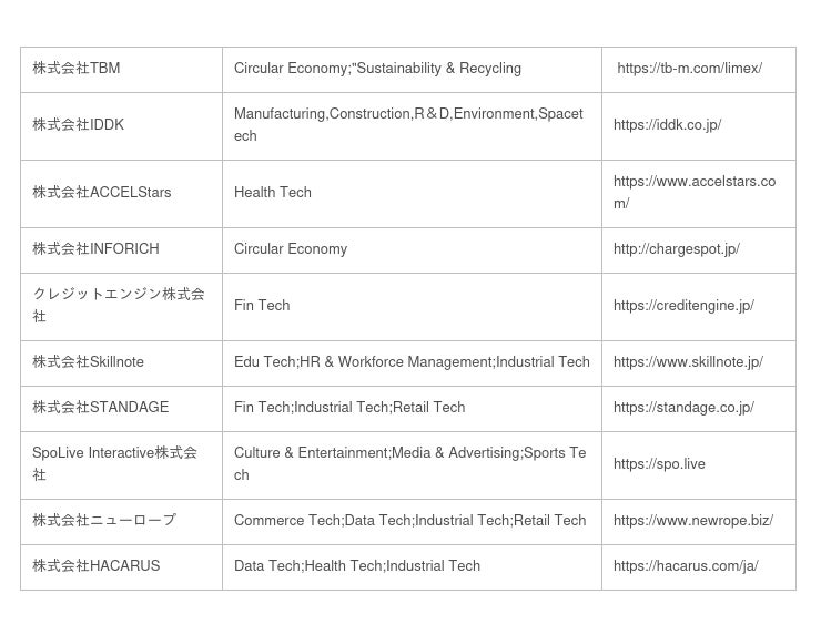 なお、メインプログラムへ採択された企業は、以下の通りです。