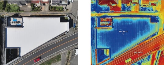 【導入事例2.】ネッツトヨタ埼玉熊谷店の俯瞰写真(左)とサーモグラフィ画像(右)周囲の道路の温度が約59℃なのに対し、「イノベーションプルーフRR」を施工した建物屋上の表面温度は約39℃に抑えられている。